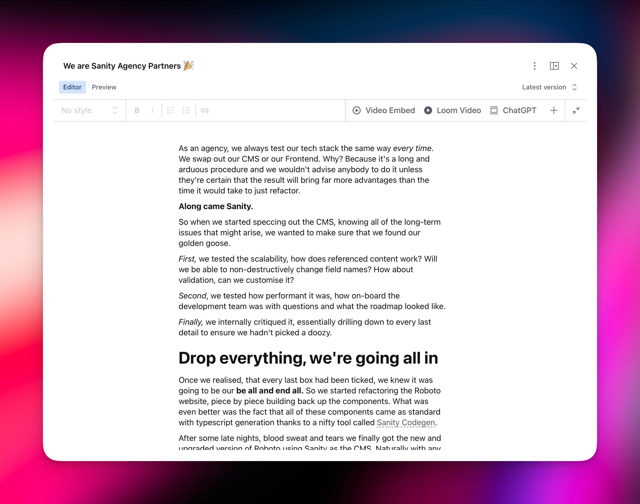 After some late nights, blood sweat and tears we finally got the new and upgraded version of Roboto using Sanity as the CMS. Naturally with any new technology there's an element of honeymoon period... However, we're still well and truly feeling the love, far outside of that... In fact so much so, that I'm typing this with the new Sanity V3 environment and loving every second of speedy content generation... Check it out.